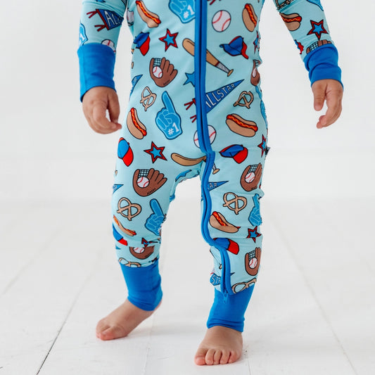 No Place Like Home Blue Baseball Zip Romper w/Convertible Footies