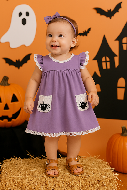 Purple Halloween Spider Embroidery Stripe Ruffle Bubble