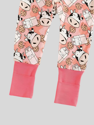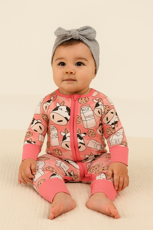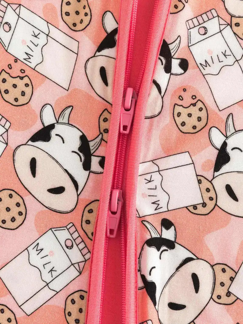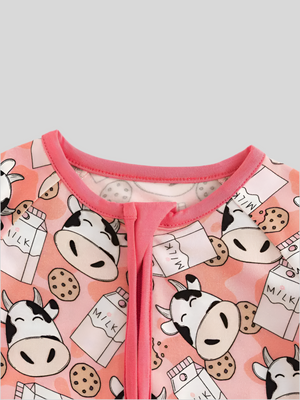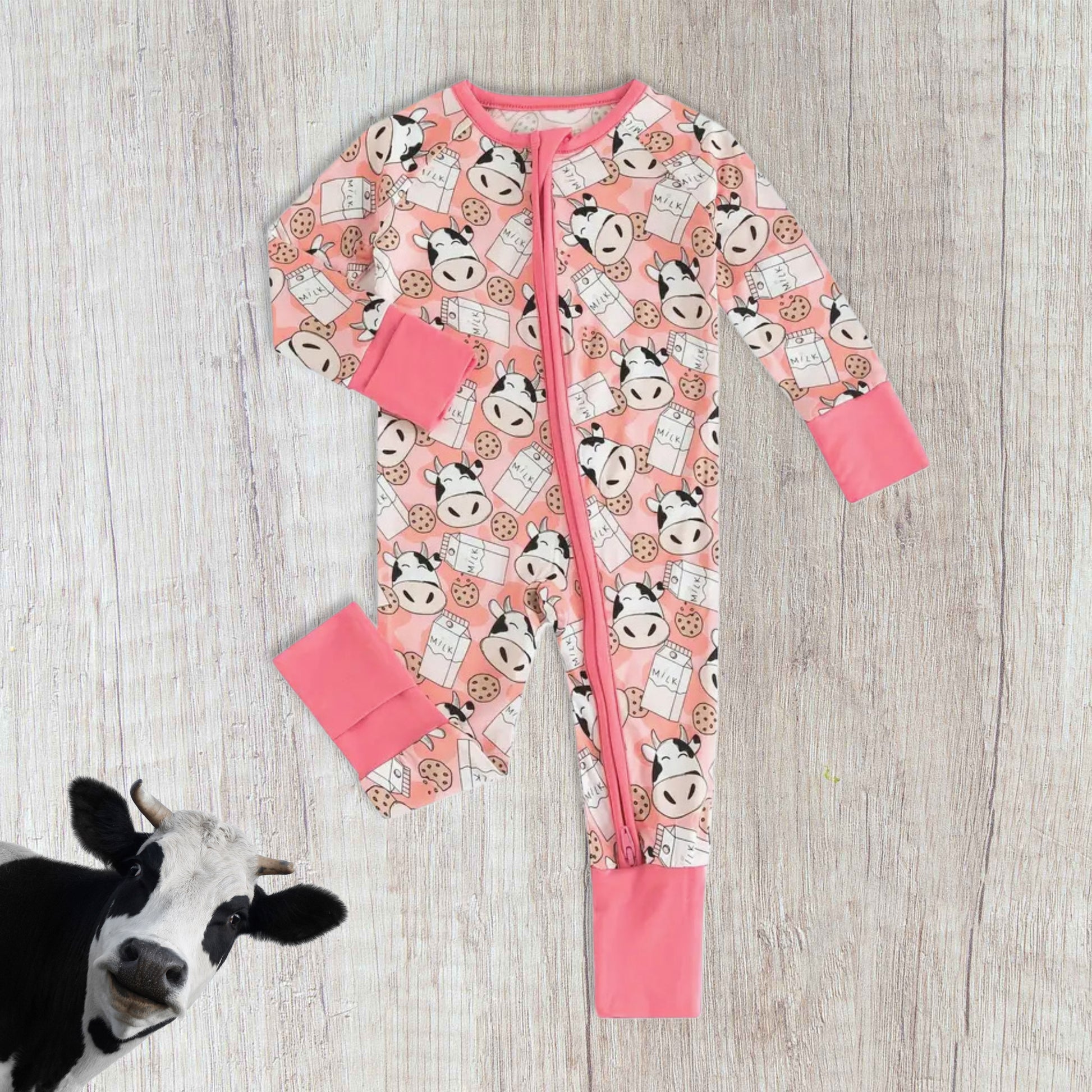 Featuring adorable cow and cookie prints, it brings a touch of fun to every outfit, whether they're exploring the backyard or enjoying a cozy day indoors. Tag-less with fold-over mittens, foot cuffs, and convenient double-zip closure, this romper is designed for easy dressing and maximum comfort, ensuring your baby is ready for all of life's little adventures.