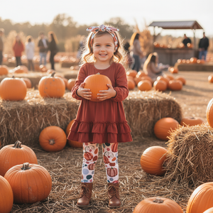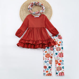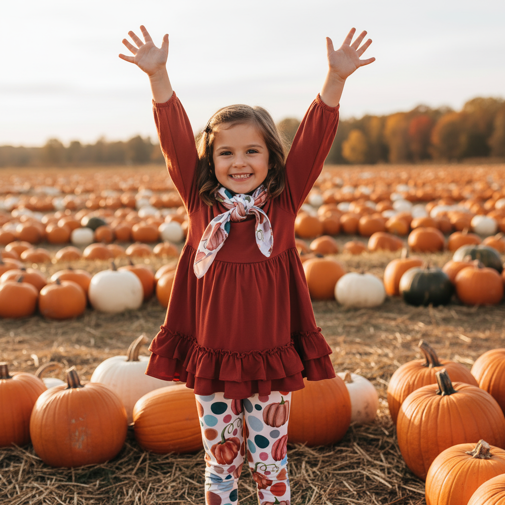 The set includes a rich crimson peplum tunic with double ruffle hem and puffed sleeves — perfectly twirl-worthy and full of charm. Paired with white leggings featuring watercolor-style pumpkins in shades of orange, coral, and dusty blue, this outfit beautifully captures the colors of the harvest season. The coordinating infinity scarf ties it all together for a boutique-ready look that’s both warm and whimsical.