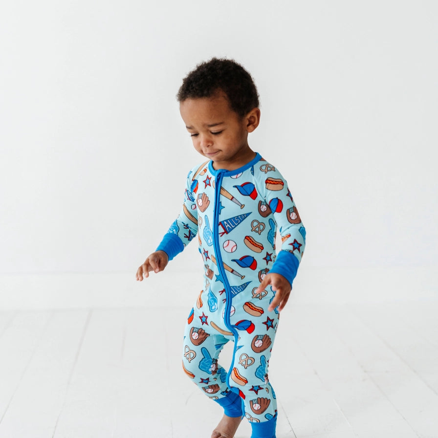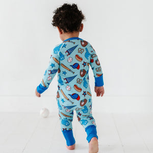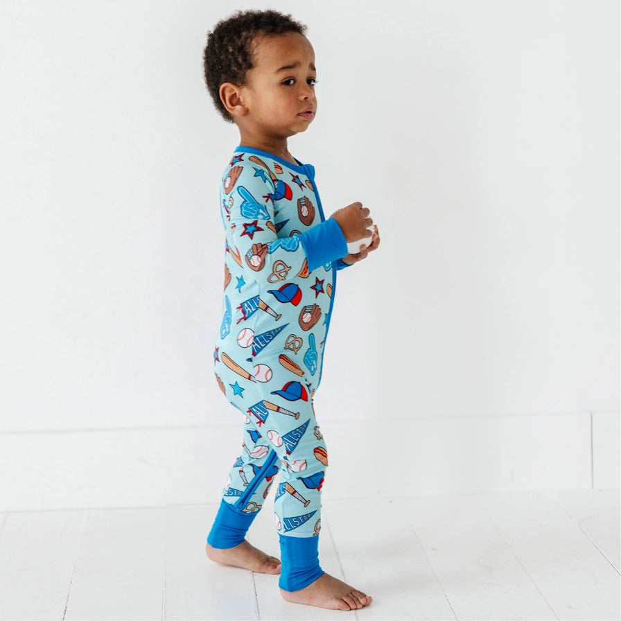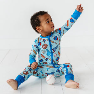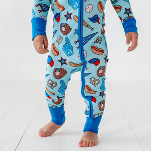 No Place Like Home Blue Baseball Zip Romper w/Convertible Footies