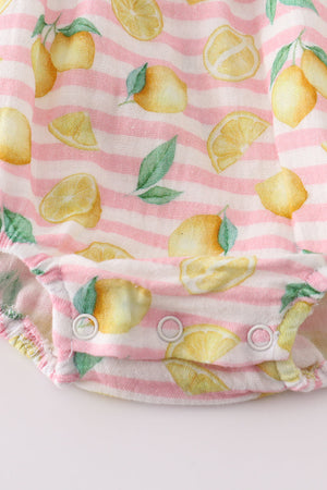 Add some zest to your wardrobe with our Pink Muslin Stripe Lemon Bubble! This playful piece features a refreshing lemon print on a pretty pink muslin fabric, making it perfect for a sunny day out. Stay stylish and comfortable in this quirky and fun bubble. (No lemons included!)