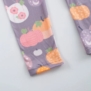 The outfit features a peachy-pink ruffle tunic top with double-layered hem and puffed sleeves for that boutique-style charm. Paired with soft lavender leggings adorned with pastel pumpkins and fall florals, the set strikes the perfect balance of whimsy and warmth. The matching infinity scarf/headband completes the look, making it easy to mix, match, and style for picture-perfect fall fun.