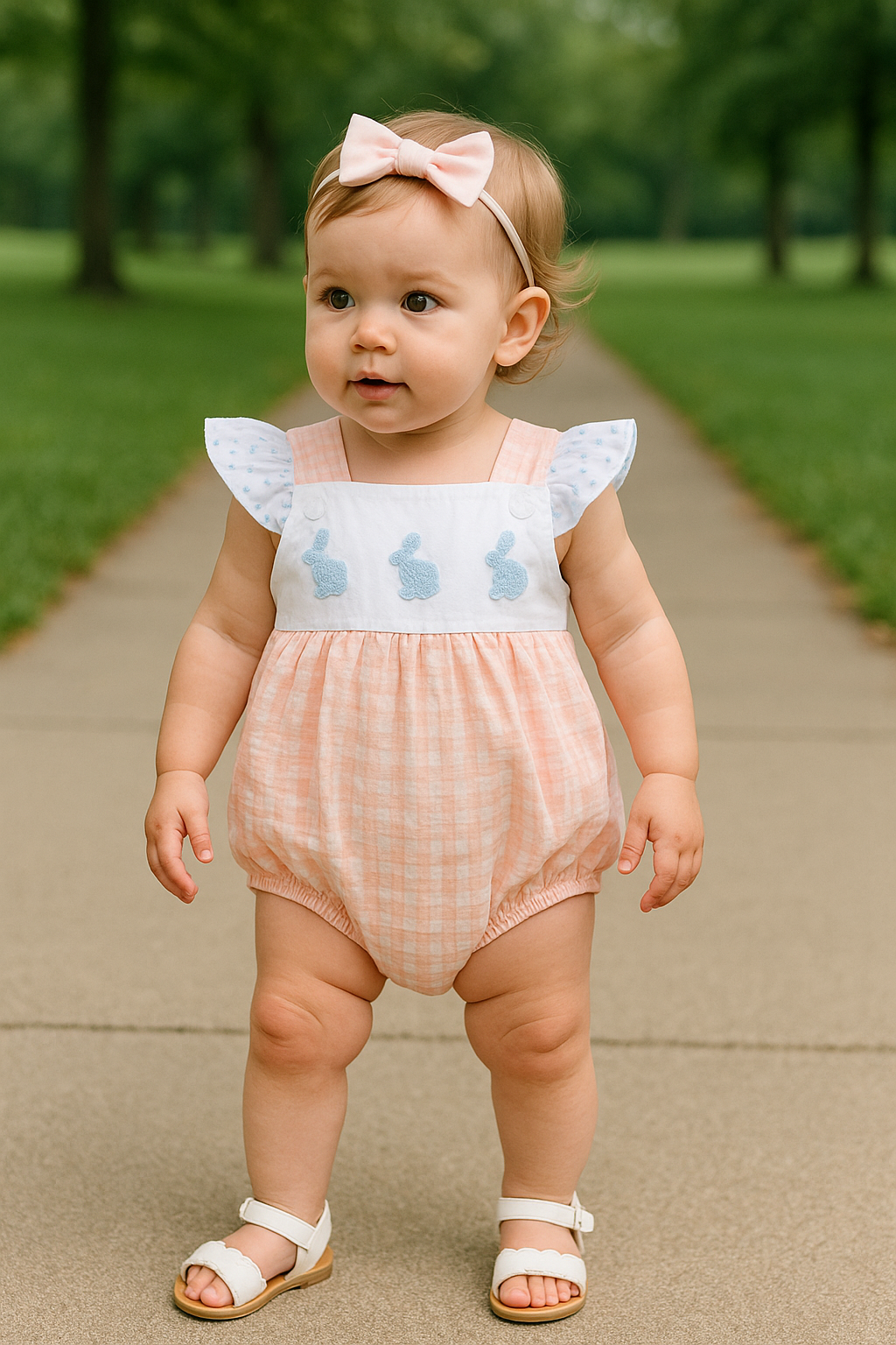 Hop into style with our Premium Pink bunny embroidery gingham bubble! The cute bunny embroidery adds a playful touch to this high-quality, gingham bubble. Perfect for your little one's wardrobe. (Bunny ears not included!)
